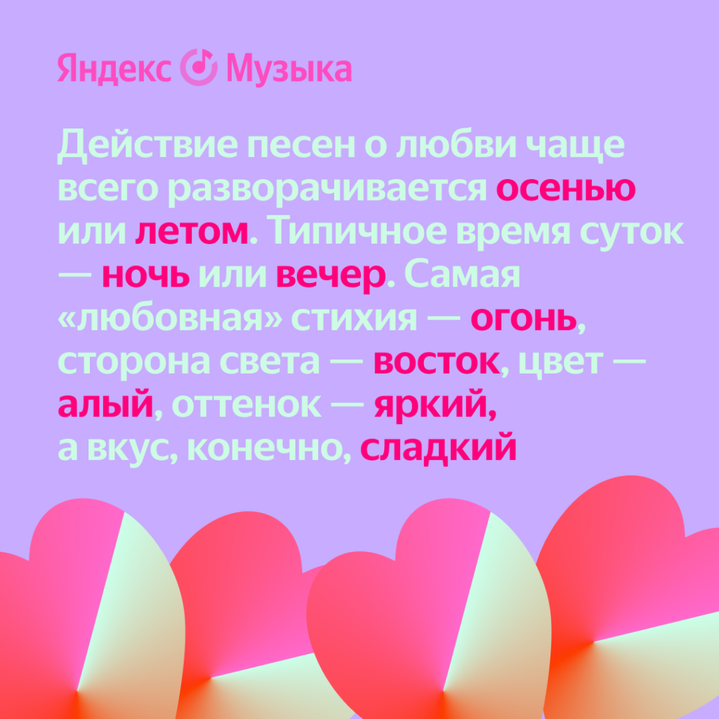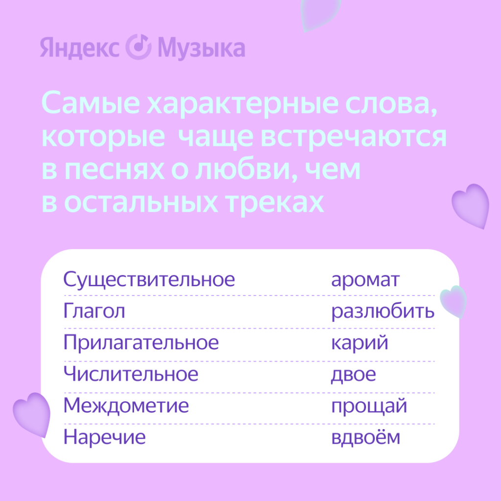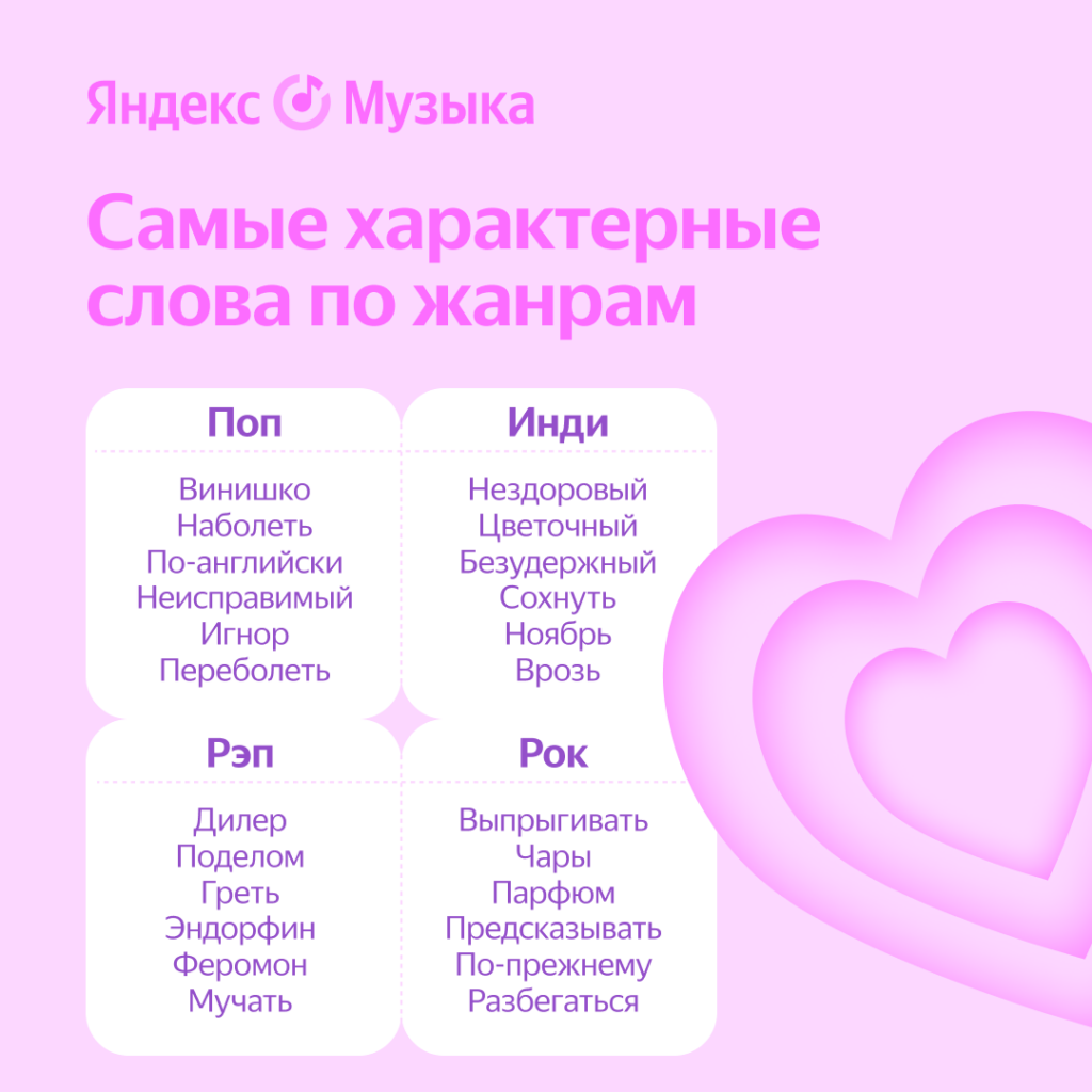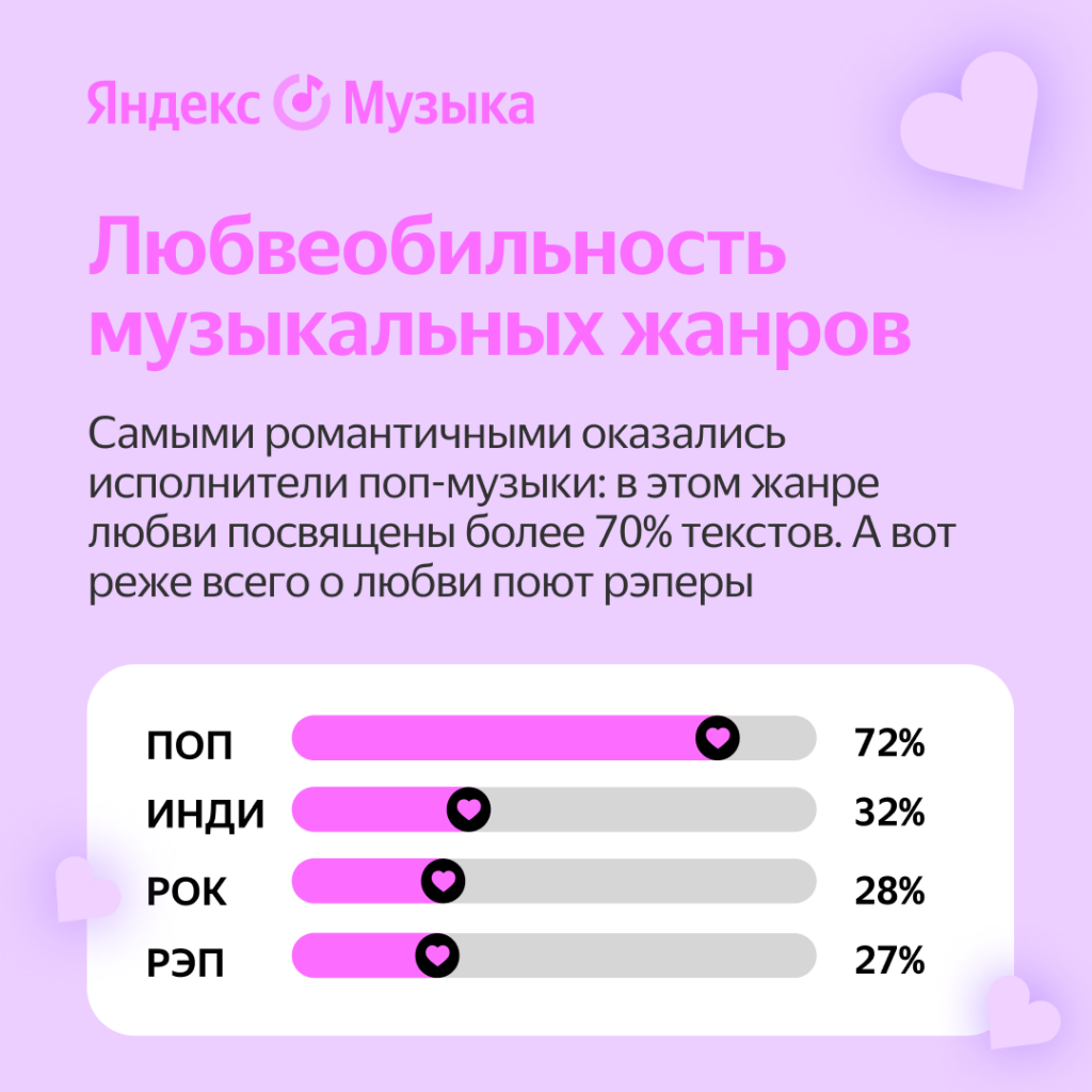 Самым романтическим жанром ожидаемо стала поп-музыка — более 72% песен посвящены любви. Среди самых «любвеобильных» поп-исполнителей оказались Artik&Asti, Юрий Шатунов и NЮ. На втором месте оказался шансон, а реже всего о светлом чувстве поют рэперы и рокеры — 27% и 28%. Для каждого жанра также отобрали самые характерные слова: у лидирующей поп-музыки это винишко, наболеть и по-английски, у рэперов — дилер и поделом, а исполнители шансона поют о девчоночке и черемухе.