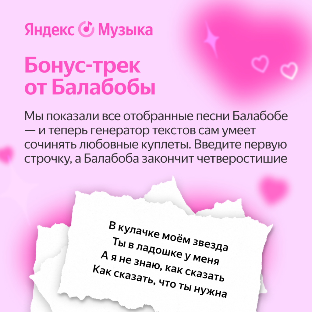 Ко дню всех влюбленных подготовился и Балабоба — он изучил несколько тысяч треков о любви на Яндекс Музыке и теперь умеет сочинять куплеты. Достаточно ввести первую строчку, и Балабоба сам закончит четверостишие.