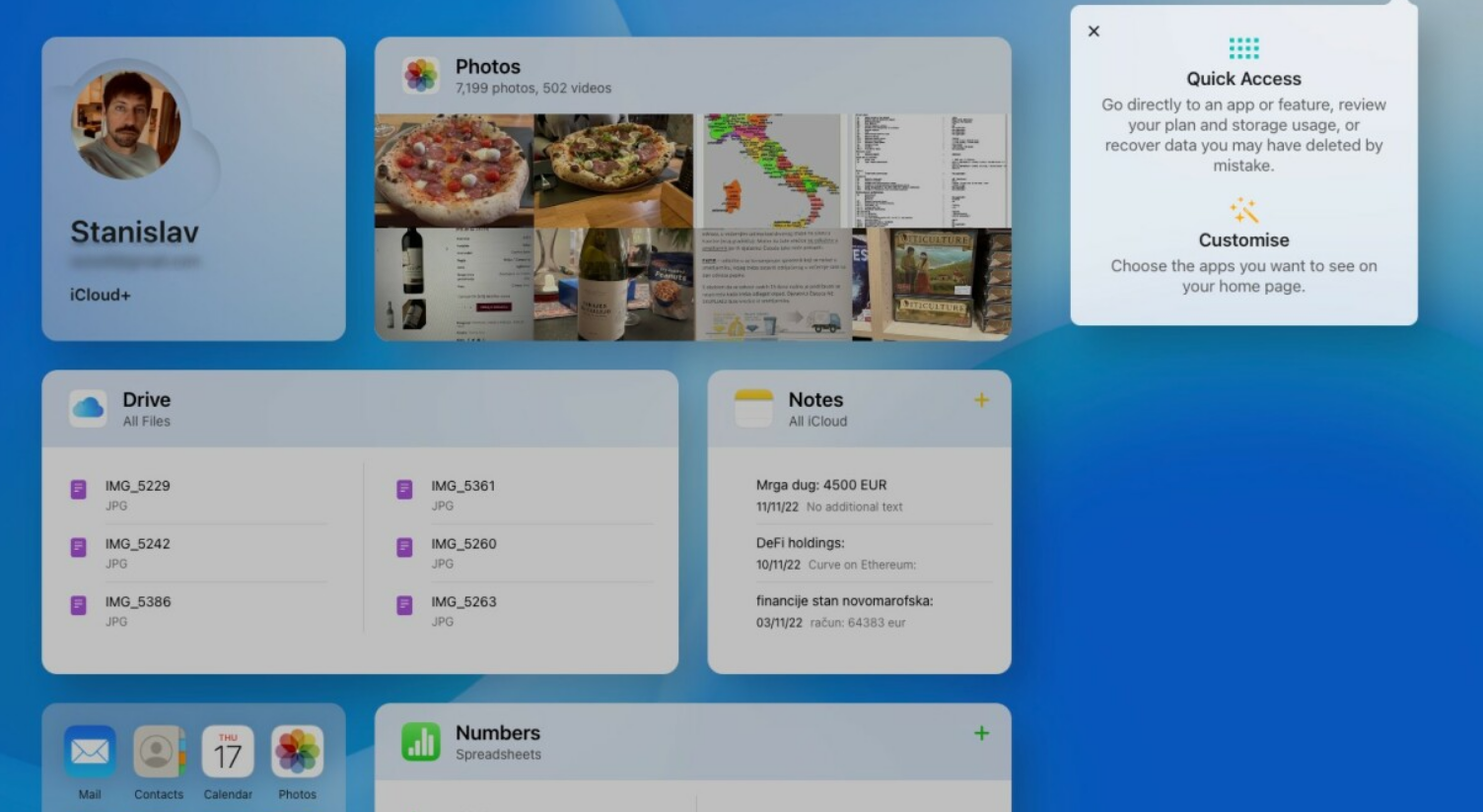 По сути, это домашний экран iPad. С новым дизайном появился довольно удобный обзор всего, что вы храните в облаке Apple. Интерфейс теперь напоминает интерфейс iPad, а такие приложения, как «Фотографии», «Почта», «Календарь» и «Диск», организованы в виджеты разного размера. Вы их можете перемещать или включать и выключать, нажав на кнопку «Настроить домашнюю страницу» в нижней части дисплея. Там вы найдете краткий обзор состояния вашей учетной записи включая стоимость вашего тарифного плана и объем оставшегося хранилища. Жаль, что нельзя сменить обои. Некоторые приложения являются избыточными; например, Find My поставляется с предустановленной версией на Mac, и уведомление в верхней части экрана фактически сообщает вам об этом, когда вы пытаетесь открыть приложение на iCloud.com. Большинство приложений не изменились со времени предыдущей итерации и по-прежнему ощущаются как урезанные версии приложений для iPadOS или macOS. Apple выпустила, пожалуй, самое приятное обновление для самого приложения, которое в основном ведет вас на страницу настроек. Теперь в нем содержится четкий и понятный обзор вашего тарифного плана iCloud, подробная информация о том, как вы используете облачное хранилище, параметры восстановления данных и активные функции. Все это было доступно и на старом сайте, просто сейчас на него приятнее смотреть.