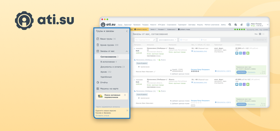 «Биржа грузоперевозок ATI.SU» обновила сервис «Заказы», позволяющий полностью оформлять грузоперевозки через ATI.SU. Пользователям доступны обновленный вид карточки груза, улучшенный интерфейс разделов «Ваши грузы», «Заказы от вас» и «Отчёты», возможность указать время бронирования и другие индивидуальные конфигурации. Новые персональные настройки делают систему максимально гибкой и кастомизируемой под бизнес-процессы грузоперевозчиков, а работу с грузами и заказами – более удобной.