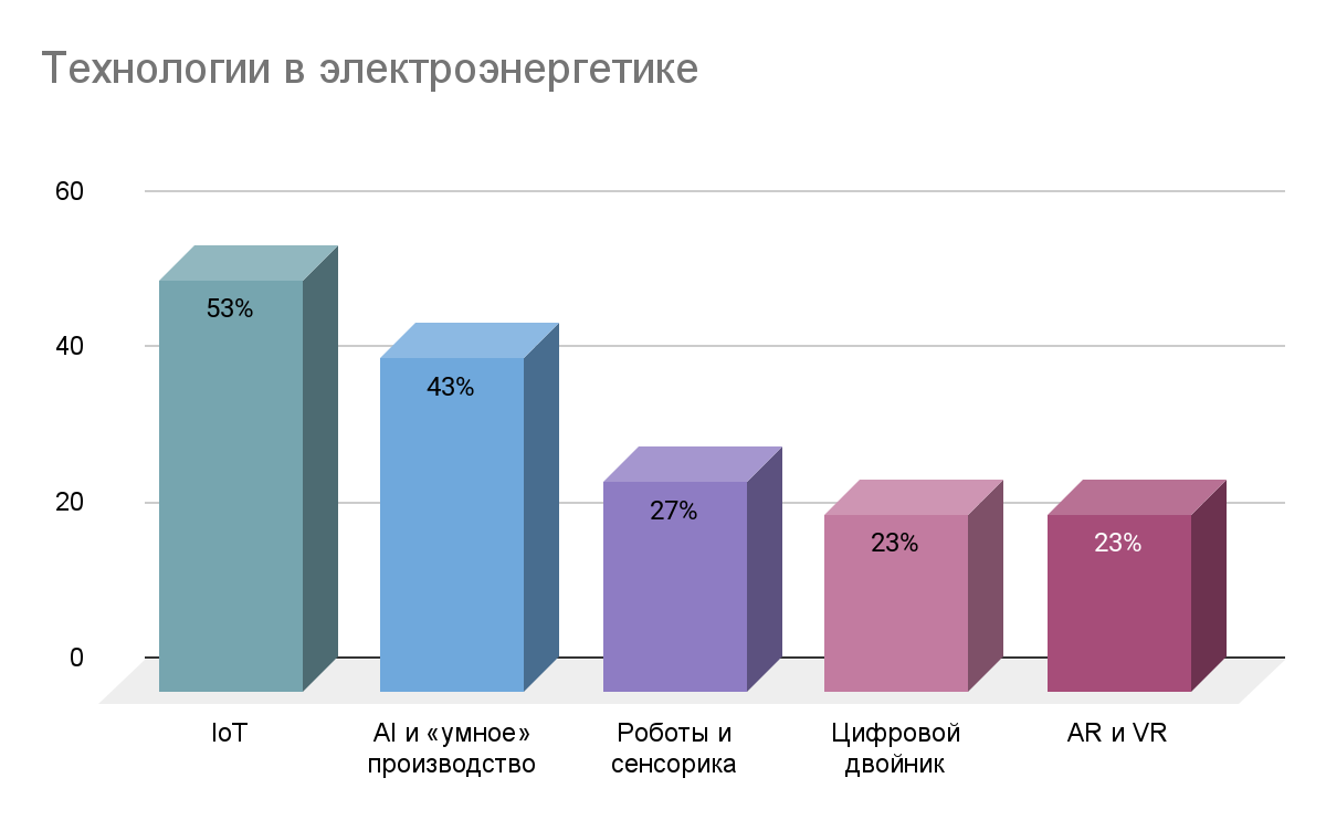 Электроэнергетика является лидером среди всех рассматриваемых отраслей по применению технологии интернета вещей (IoT) и занимает второе место по применению систем «умного» производства. Для контроля передаваемых потребителю мощностей применяются технологии «умных» подстанций, включающие системы релейной защиты и управления, обеспечивающие бесперебойную работу станций за счет передачи данных от оборудования «интернетом вещей».
