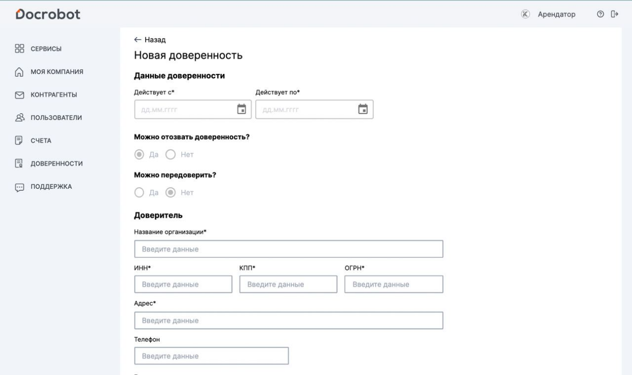 Для работы с МЧД достаточно перейти во вкладку «Доверенности» в личном кабинете, нажать кнопку «Добавить доверенность» и создать документ. Затем необходимо указать дату и заполнить данные доверителя.