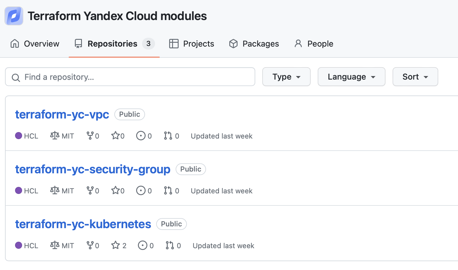 Yandex Cloud поддерживает Terraform с 2018 года. Модули усиливают эффективность работы с инструментом. В них собраны все практики по развертыванию управляемых сервисов от специалистов облачной платформы. Сейчас модули позволяют создать кластеры Kubernetes, PostgreSQL, MySQL и ALB, VPC и Security Group. Их количество на GitHub будет увеличиваться. Модули Terraform есть у всех крупнейших облачных провайдеров в мире, в том числе у AWS, Microsoft Azure и Google Cloud. Также использование модулей рекомендовано и HashiCorp, компанией-разработчиком Terraform.