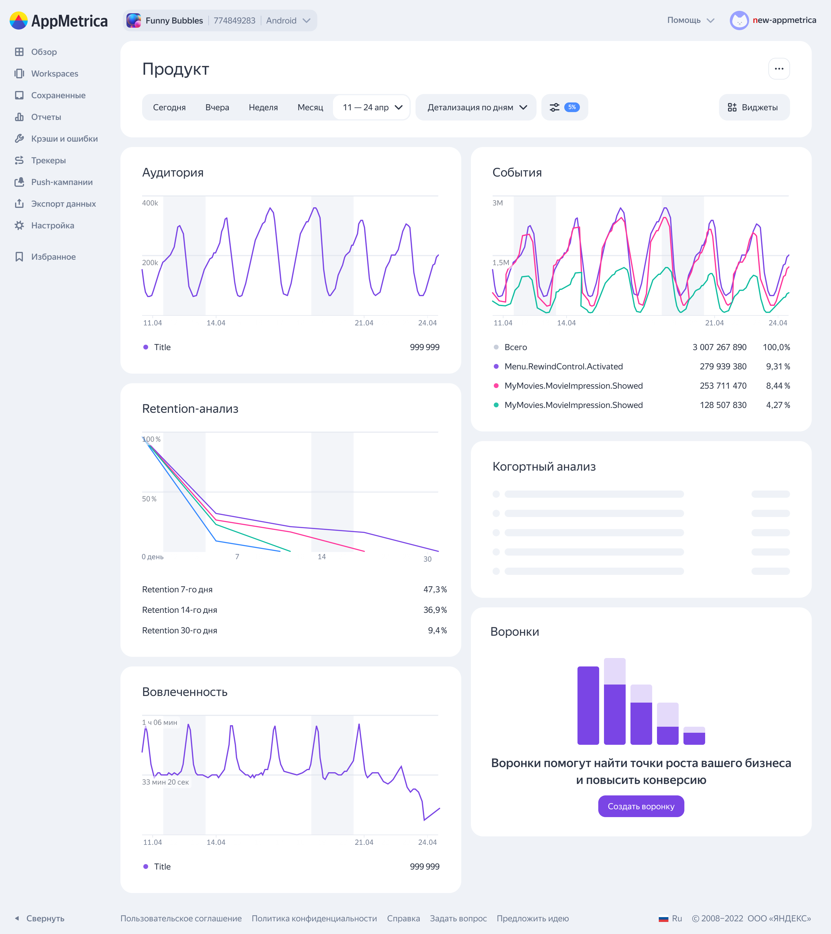 В AppMetrica — сервисе для трекинга и продуктовой аналитики мобильных приложений от Яндекса — появилось новое решение Workspaces для быстрой настройки визуализации данных о показателях работы мобильного приложения. С Workspaces можно создавать автономные дашборды с наглядным представлением финансовых, продуктовых или маркетинговых метрик приложения. Пользователи могут быстро настроить представление любых данных из AppMertica для постоянного контроля показателей или в случае, когда необходим оперативный анализ ситуации.