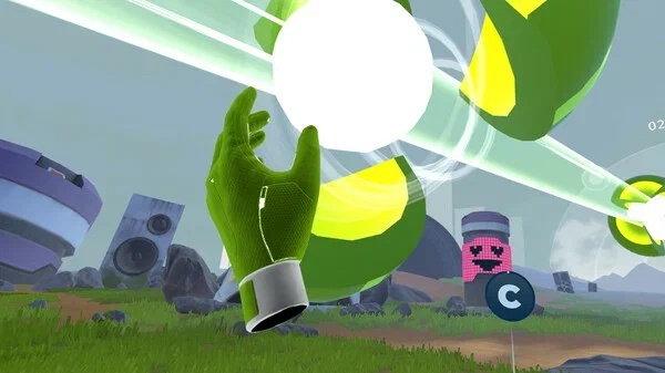 «Первая локация – метафора, забытый музыкальный мир, классический фантастический пейзаж с руинами былой цивилизации. Если электронный музыкант, начитавшись научной фантастики, делает себе обложку альбома, получается история перекладывания руин на какие-то музыкальные инструменты. Мы решили переложить на динамики. У Жан-Мишель Жарра есть обложка: горизонт и странные фигуры, которые смотрят на тебя в бинокль. Вторая локация – у игрока под ногами маленький диск, как летающая тарелочка. Игрок, как Серебряный сёрфер, летает по другим мирам и собирает музыку. Ключевой момент – портал в космос. Мы использовали эффект параллакса, то есть, если начать двигать головой, появляется глубина в том пространстве, словно игрок даёт концерт всему космосу сквозь этот портал».
